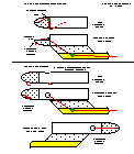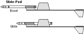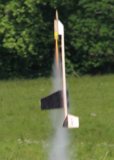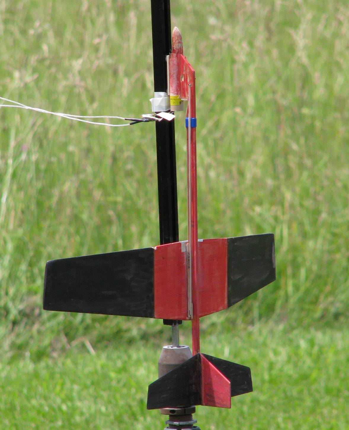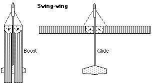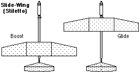 Slide-Wing - The wing is mounted in a manner that allows it to slide along the fuselage, so the wing is towards the back for launch (moving the CP rearward), then at ejection moves forward for glide. They tend to boost very straight. The wing slide mechanics are somewhat more difficult to build than others, but it is usually worth it. Slide-pod - A long engine pod about the length of a normal pop-pop is used. The pod is forward on boost (making the CG forward like a normal pop-pod B/G) then at ejection slides back so that the CG is where it needs to be for glide. It is a reasonable approach which usually boosts OK, and is easier to build than a slide-wing. Well-made slide wings tend to perform better than well-made slide-pods. Slide-pod models use a telescoping external tube glued to the pylon, such as 20mm telescoping tubing, for a BT-20 sliding pod tube to freely slide inside of. Auto-Elevator - A design which does not move the wing, or move the CG, but changes the angle of the elevator (or canard). The elevator has to be flat (straight) for boost so there is no incidence angle between the wing and tail, so the model will boost straight. For glide, the elevator moves up (or canard trailing edge moves down). This is often one of the simplest and easiest rocket glider designs to use. Although depending on the particular model design, the performance potential might be compromised. The Xebec-B is an auto-elevator design, which is easy to build as R/G's go. But it is somewhat finicky as to how straight it boosts, varying from model to model (and sometimes modeler to modeler). Usually it if does not boost straight, it pitches up a bit onto its back, due to unintended slight up elevator angle. Swing-Wing - Originally a definitive early design for Rocket Gliders, the wings pivot from rearward for boost to forward for glide. They are neat to see fly and deploy, but tend to be too heavy and complex to be competitive other than in the higher engine classes. For B engine class, it's not very competitive. No Moving Parts - A special design that, as it's name says, has no moving parts. So, it is about the simplest Rocket Glider to build (That has wings, anyway). This approach was tried when the event was first created, but only experts had any decent success trimming their models to boost straight and transition to a glide. More recently, Kevin Wickart has come up with a design called the "Mediocre Fred", which is not as finicky as the early designs, but must be built exactly as described. It was a plan in Sport Rocketry magazine, and also is available online on the WOOSH website. It is designed for D power, but can be flown on a B6-2. Ideally, for B class it should be scaled down. "Backslider" Superroc Rocket Glider - Bob and Peter Alway wrote a winning R&D report resulting in the "Backslider" plan. It is a type of super roc rocket glider, which is basically a long skinny "normal" rocket going up, that glides down backwards using lift from the long body tube and fins (read the report to understand how). It does not glide very well compared to normal R/G's, but has been used by some for qualified flights and "return" flights. And in some smaller contests has taken places when used as the primary (or only) model a competitor flew. Depending on the resulting CG due to the parts used and assembly, a given Backslider model might require a little bit of clay (not too much) to be added to the root of one fin to make sure it glides backwards, rather than falling horizontally (which is not a glide).