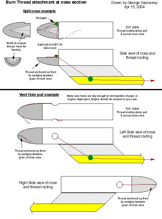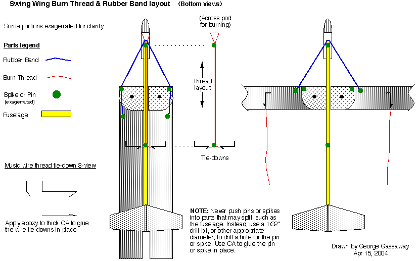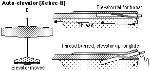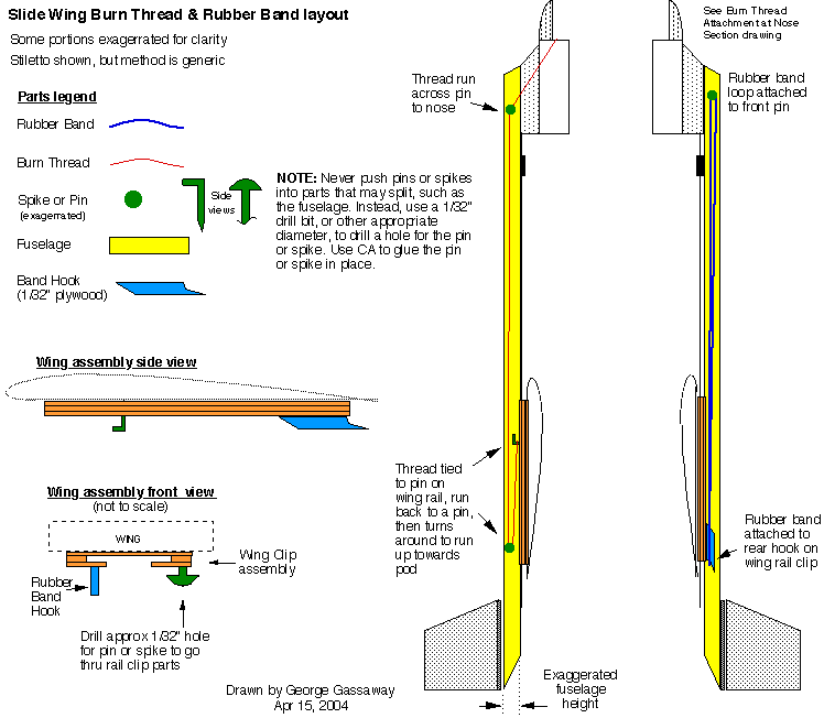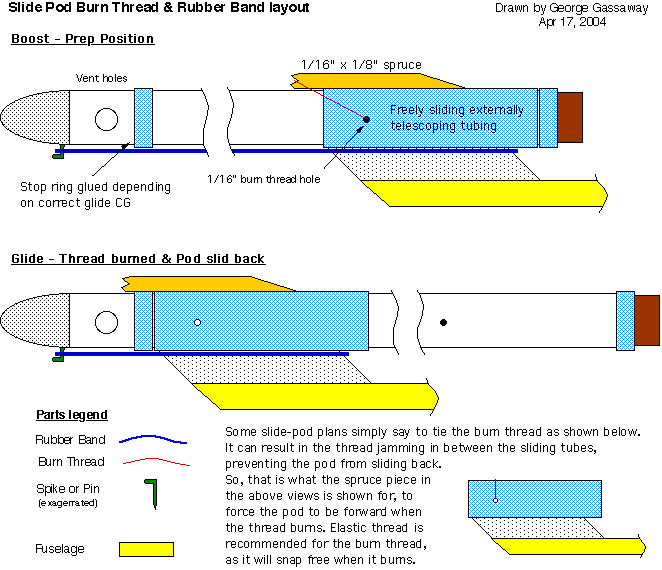 Deployment magic - The above R/G designs (excluding the Backslider and No Moving Parts designs) use the ejection charge only as a starting point to cause the design to go from rocket boost mode to glide mode. Usually rubber bands are used to make the wings slide, pods slide, wings swing, or elevator to move. What keeps them from moving until ejection? Usually a burn-thread which is rigged to hold the model in boost mode. At ejection, the thread burns, allowing the rubber bands to do their thing.